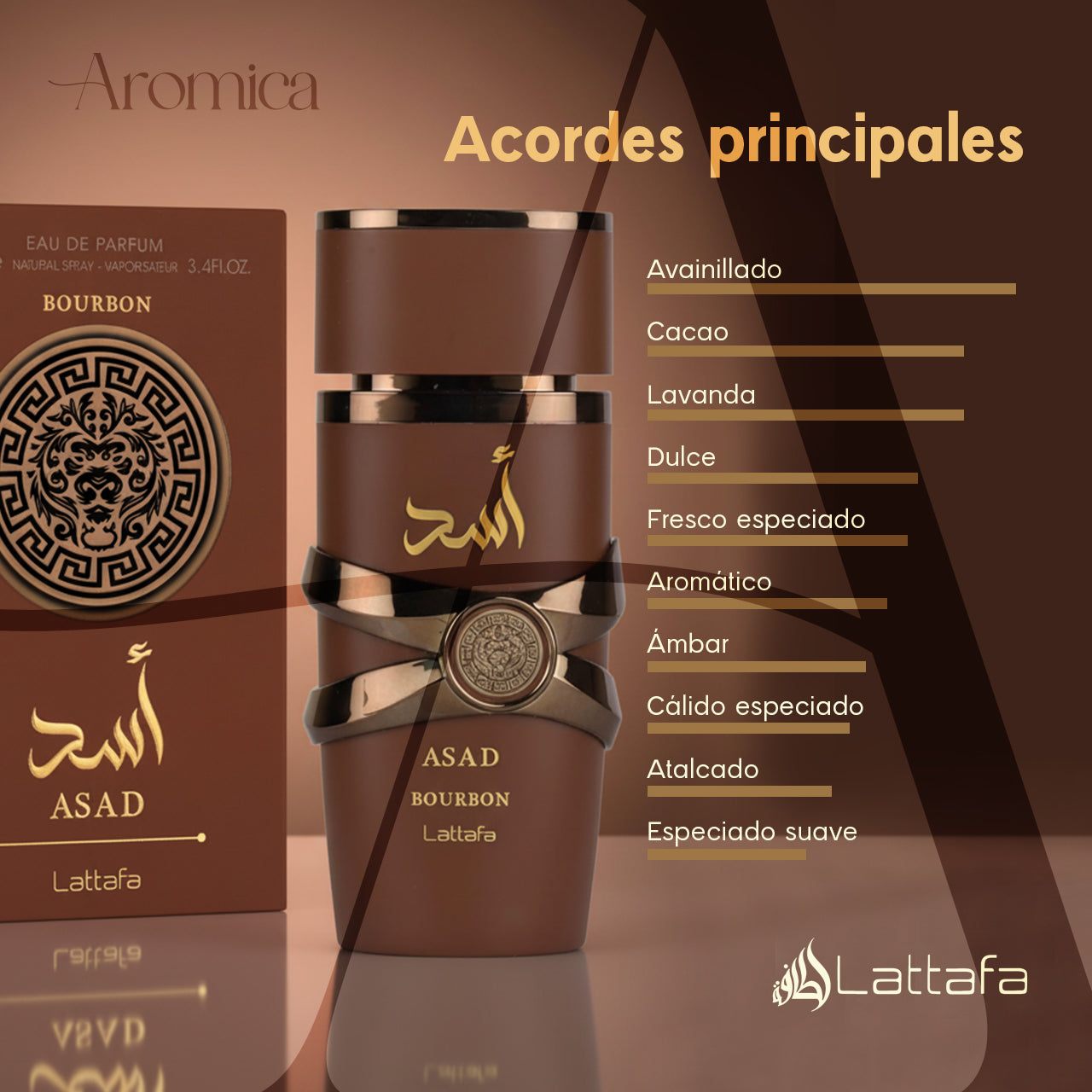 Bourbon de Lattafa es una fragancia que mezcla poder, elegancia y sofisticación. Abre con notas especiadas y cítricas que despiertan los sentidos, seguidas por un corazón ambarado y ligeramente dulce. El fondo de vainilla, cuero y maderas nobles aporta profundidad y una estela envolvente que transmite confianza y estilo.